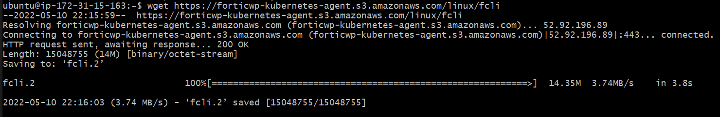 wget https://forticwp-kubernetes-agent.s3.amazonaws.com/linux/fcli - Change the permission of the fcli command line tool:
