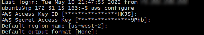 aws configure, enter your AWS Access Key ID and AWS Secret Access Key, leave Default region name and Default output format as empty. (The AWS Access Key ID and AWS Secret Access Key is only accessible to you when you created your AWS account) - Now you can access the AWS EKS cluster, type