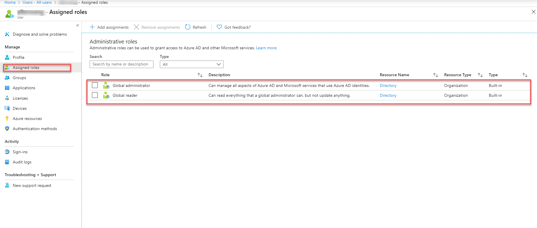 - Click +Add assignments to add Global reader role and Global Administrator role to the user. (Global Administrator role will be removed later)