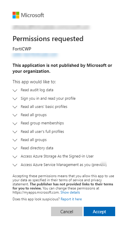 - Azure will be prompt you to grant the same permissions 3 more times, then you will be re-directed back to FortiCNP.