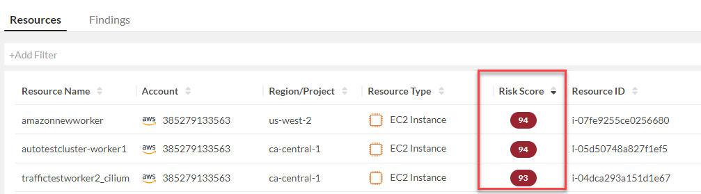 Resource Risk Score is the overall risk score calculated based on the sum of Risk Management Scores, Threat Scores, and Vulnerability Scores of the cloud resource.