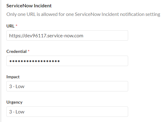 - In Impact and Urgency parameter, enter the impact parameter for the ServiceNow incident: "1 - High", "2 - Medium", "3 - Low"(default), the values are case sensitive.