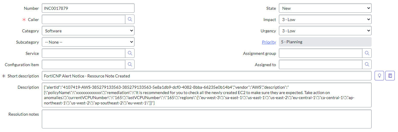 When a FortiCNP finding is generated for the notification target, a ServiceNow incident will be created with the subject: FortiCNP Alert Notice - (Finding Subject)