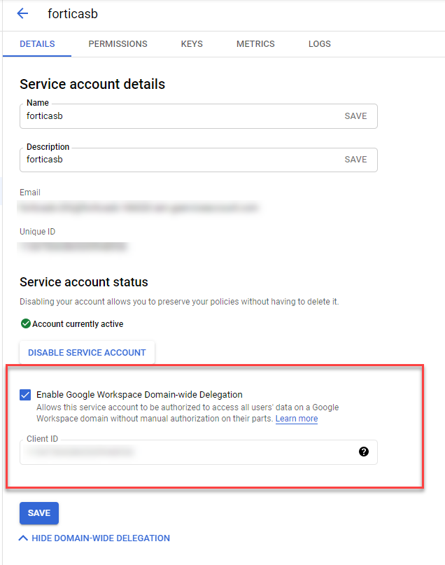 - Expand SHOW DOMAIN-WIDE DELEGATION to enable Google Workspace Domain-wide Delegation, and click SAVE.