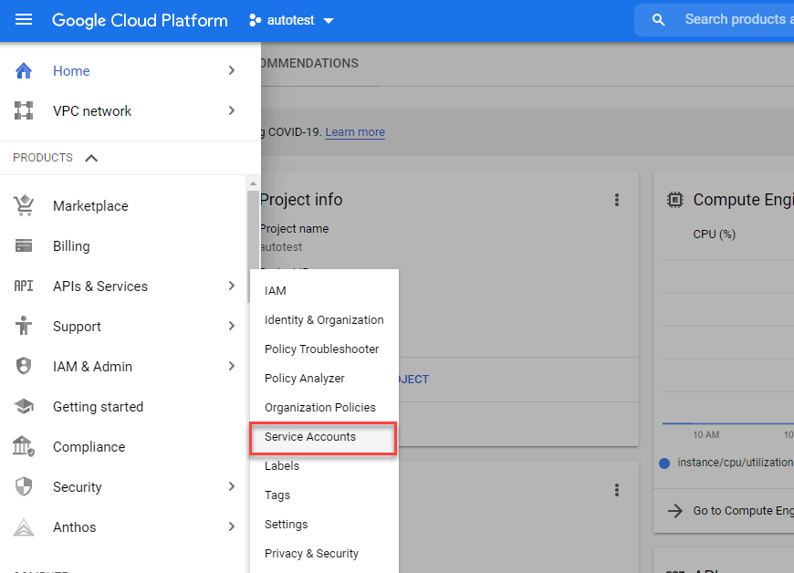 - In Service Accounts page, click on the service account created to enter Service Account Details page, keep a record of the Service Account ID (Email).