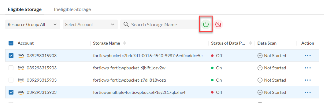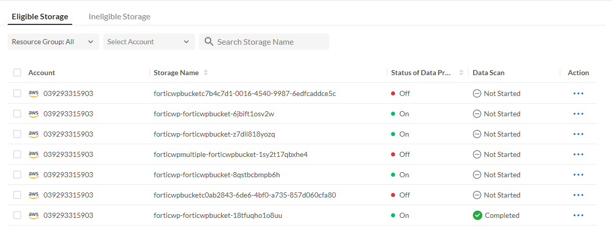 - Go to ADMIN > Cloud Accounts from FortiCNP navigation pane and select Storage tab.