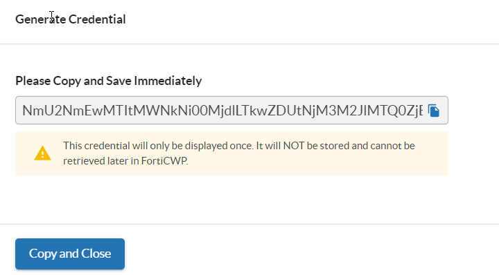 - Copy and save the credential for use later in REST API calls. and click Copy and Close