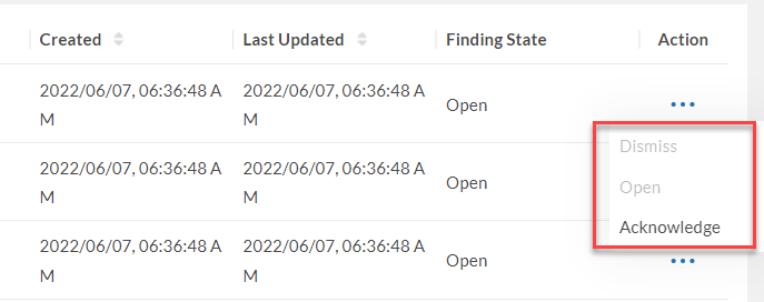 Acknowledged - For Data Scan and User Activity findings, users can only change the finding state to Acknowledged. Acknowledged finding cannot be changed to other state.