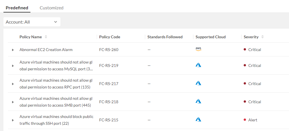Configuration risk policies is a set of configuration policies recommended by FortiCNP to check if your organization's cloud platforms follow FortiCNP recommended best practices.