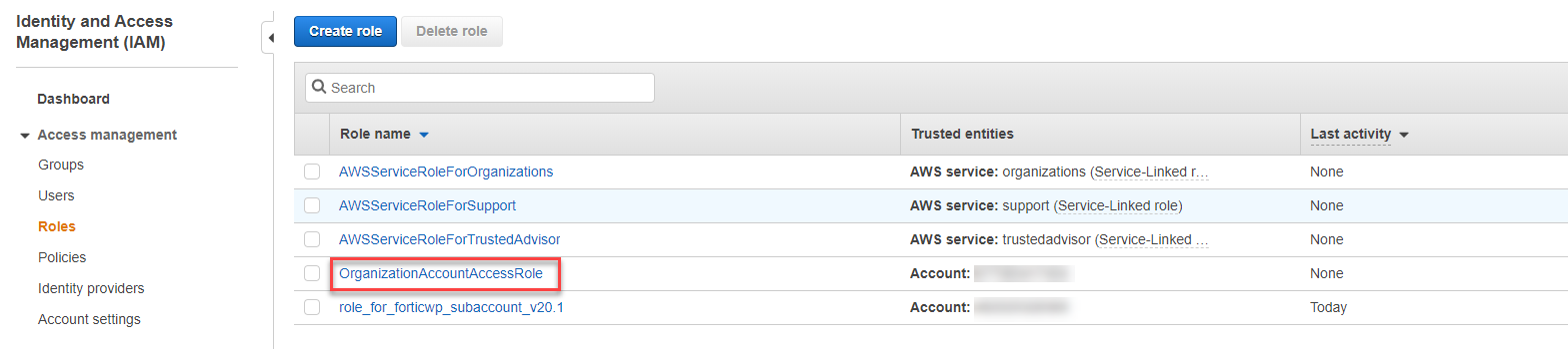 - Search and click on "OrganizationAccountAccessRole". If it is not created, proceed to next section, Add Organization Account Access Role.