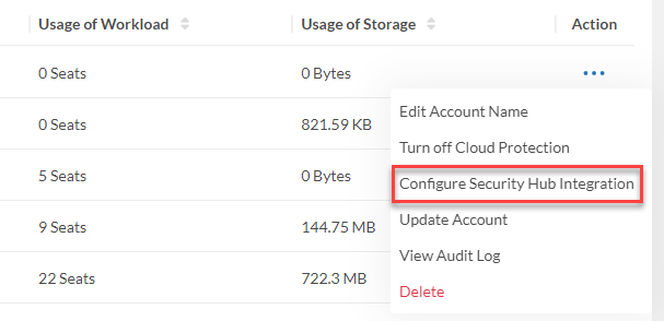 - Select the AWS account to be configured, and click Action button and select Configure Security Hub Integration.