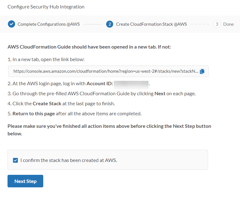 - Go back to FortiCNP Configure Security Hub Integration page, and click Next Step