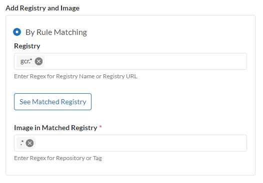 The default value in Image in Matched Registry field is ".*" where it will match all images in the registry. If only a specific image needs to be added, delete the ".*" and enter a new regex.