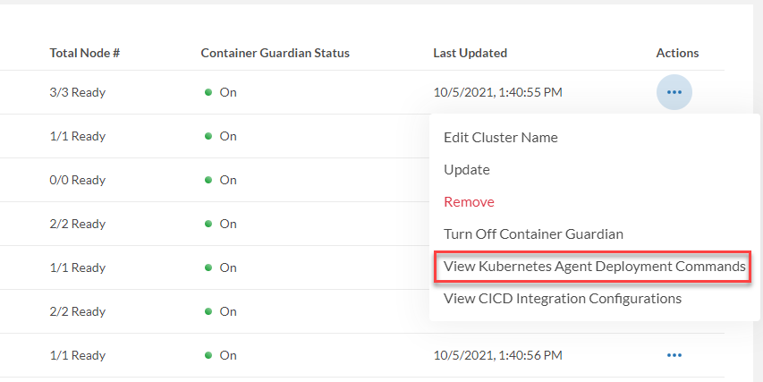 - Locate the cluster that is going to have Kubernetes Agent installed, then click on the Actions button, and select View Kubernetes Agent Deployment Commands.