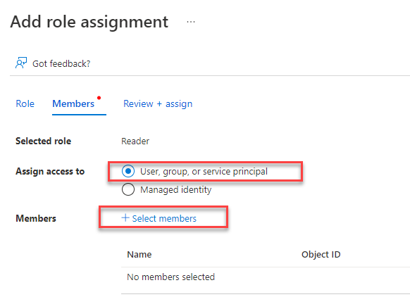 - In Members tab, leave Assign access to as "User, group, or service principal", then click +Select members.