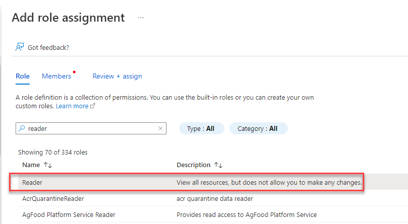 - In Add role assignment , search and select Reader, Owner, or User Access Administrator, then click Next.