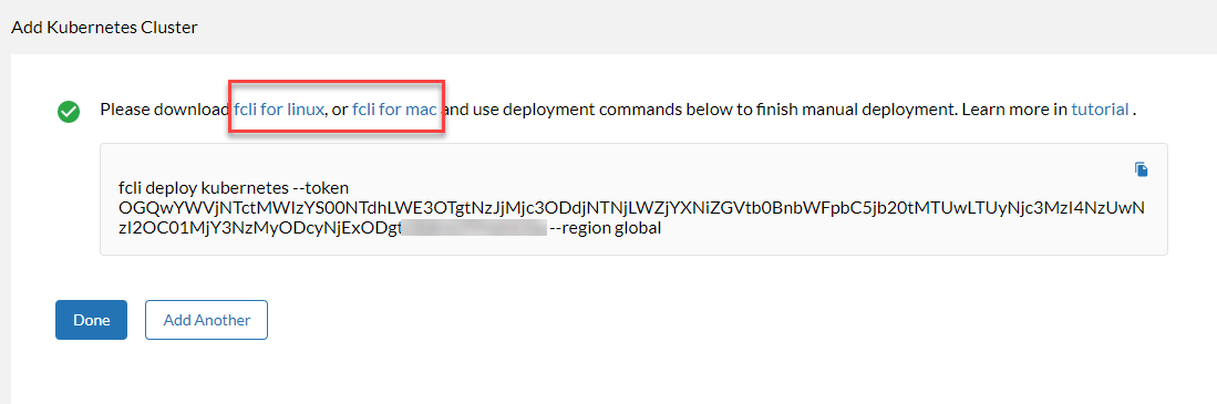 After you pressed Add Kubernetes Cluster, the fcli command line tool needs to downloaded and executed on the Kuberentes cluster to deploy the Kubernetes agent. The purpose of deploying the agent is to give FortiCNP the capability to retrieve logs and provide security monitoring.