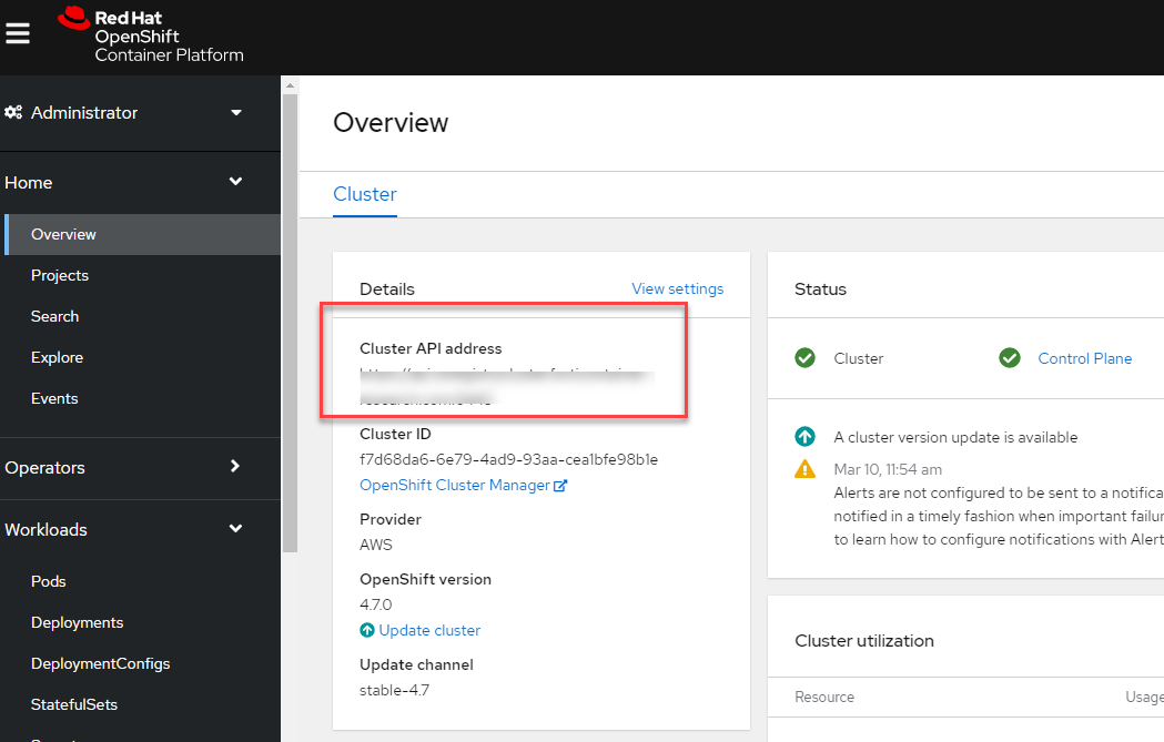 - From OpenShift cluster console navigation pane, go to Home > Overview.
