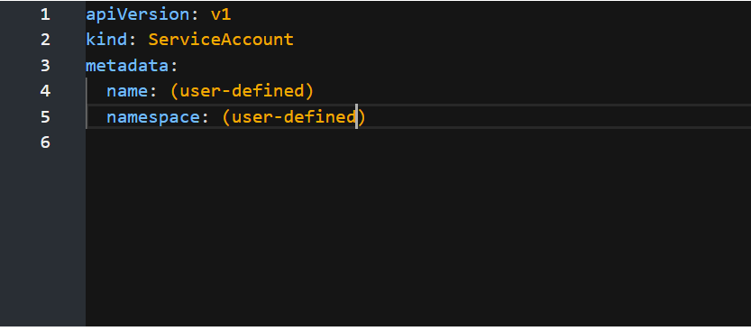 - Fill in a name and a namespace for the service account, and keep the rest of the YAML definitions as is.