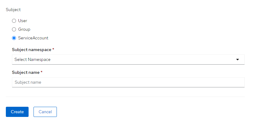 - In Subject, select ServiceAccount. Click namespace drop down menu and select the namespace of the service account created earlier.