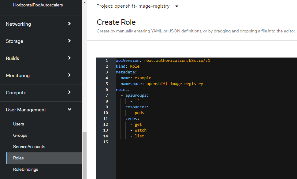 - From OpenShift cluster console navigation pane, go to User Management > Roles to enter Roles page.
