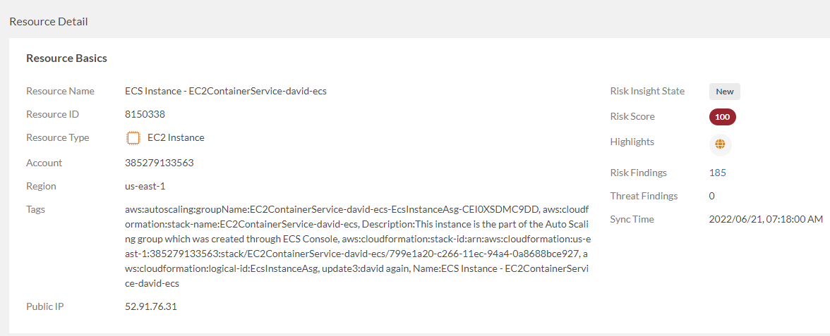 - Go to Insights > Risk > Resources tab and click on any resource to enter Resource Detail page.