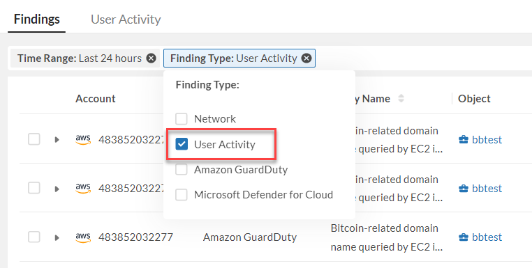 to filter the findings. - The filtered findings will only show Findings with User Activity type.