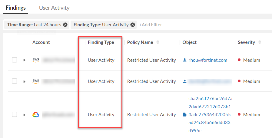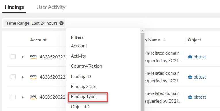 In this example, we will filter through findings to search for only User Activity Finding Type.
