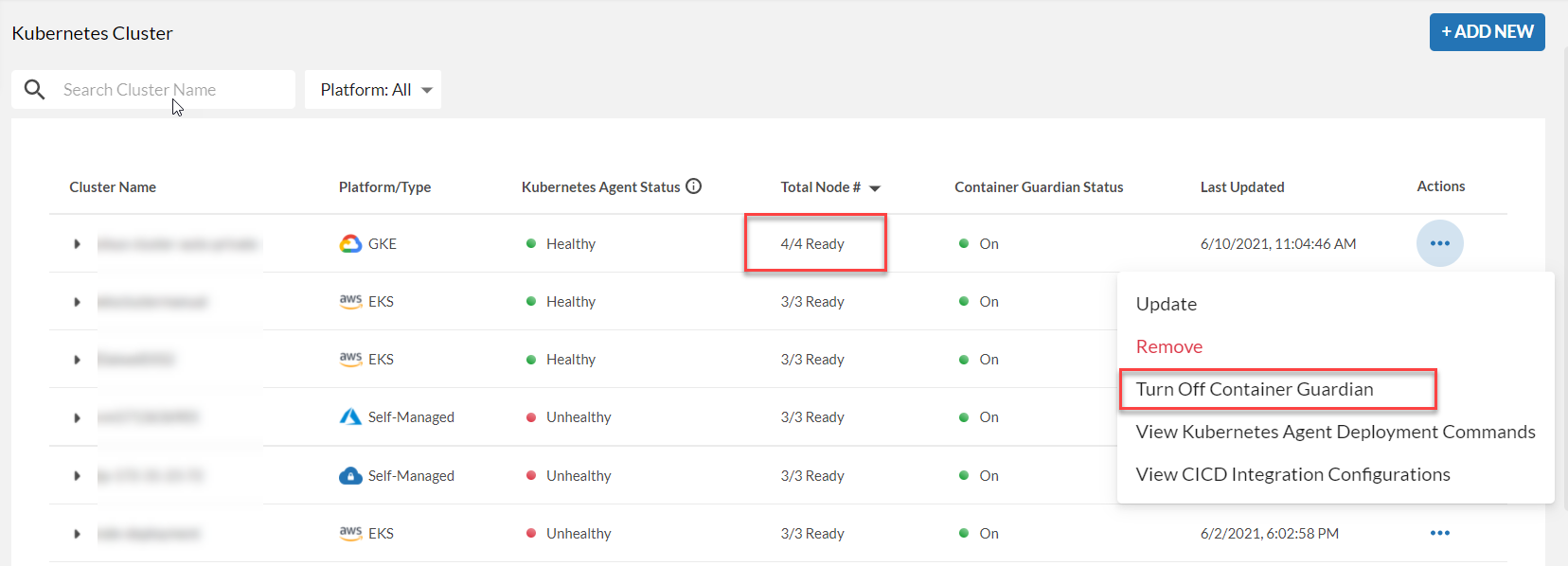 In the example above, there are 4 nodes used by the GKE Kubernetes cluster, when the FortiCNP Container Protection is turned off, all 4 nodes' license seats will be released, and the total number of license seats available would increase to 177.