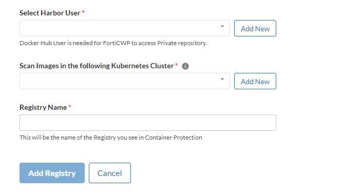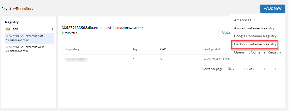 - Click +ADD NEW drop down menu and select Harbor Container Registry.