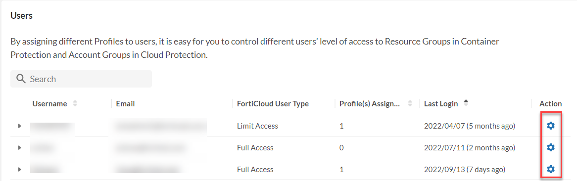 In Users, any FortiCNP user with Global Admin Profile can assign profile to another user within the same organization.