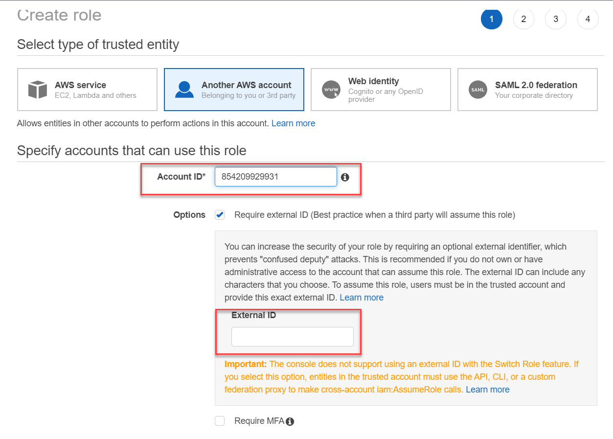 - Click Require External ID option and enter the External ID saved earlier from Add AWS Account - Manual. Then click Next:Permissions to continue to add permission policy page.