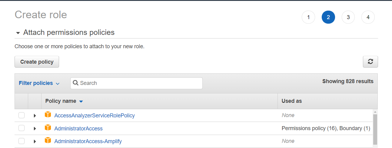 - Go back to Create role page, search and select the two policies just created, then click Next:Tags.