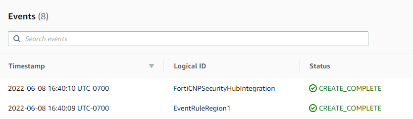 - Refresh the stack status page until the "FortiCNPSecurityHubIntegration" stack status shows "CREATE_COMPLETE".