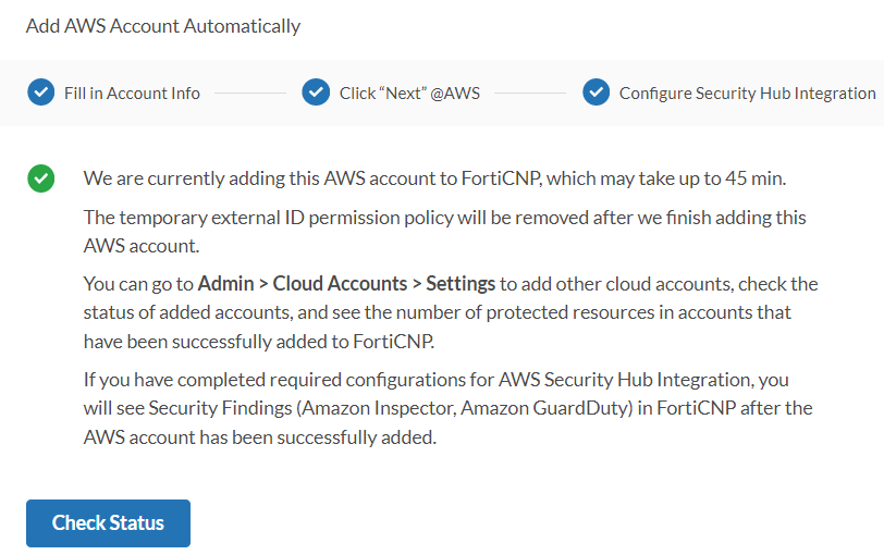After AWS account is added to Cloud Protection, please continue to AWS Traffic Configuration to activate FortiCNP Traffic feature. |