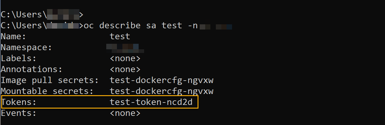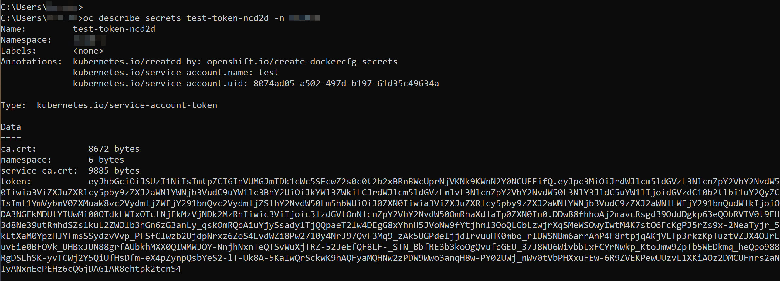 oc describe secrets <Tokens name> -n <service account namesapce>