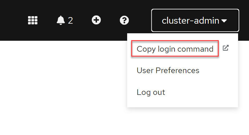 - Go to the upper right corner, click on the user drop down menu and select Copy login command.
