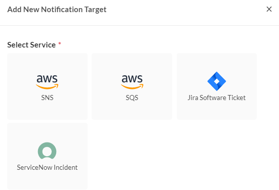 Select one of the notification service type: AWS SNS, AWS SQS, Jira Software Ticket, and ServiceNow Incident, and click Add New Notification Target.