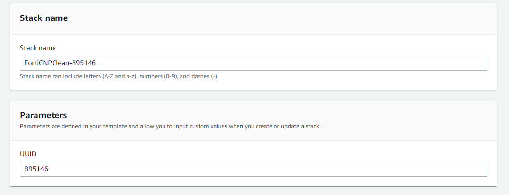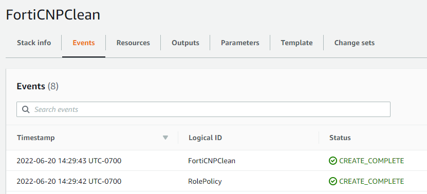 - Refresh the stack status page until the FortiCNPClean stack status shows "CREATE_COMPLETE".