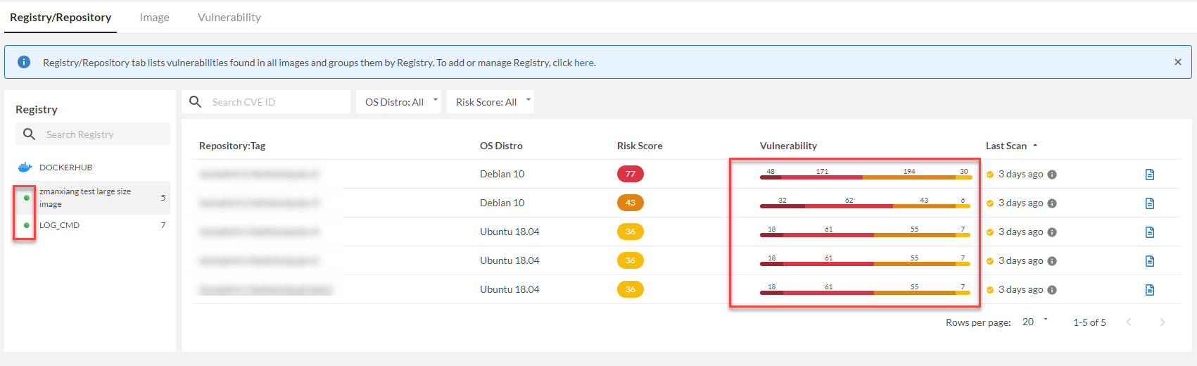 Registry/Repository View shows the Vulnerability detected with repository perspective. Vulnerabilities are categorized by repository and cloud platforms (Azure Container Registry, AWS Elastic Container Registry, Google Container Registry, Harbor, and Openshift).
