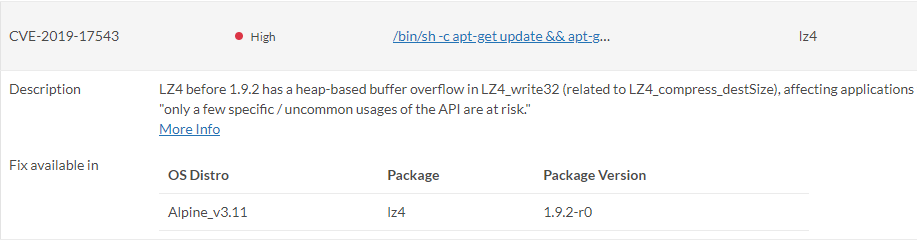 When clicking on More CVE Info, there will be detailed description of the CVE ID with a link to the National Vulnerability Database about the CVE ID. The list of fixes available is shown by the operating system and package.
