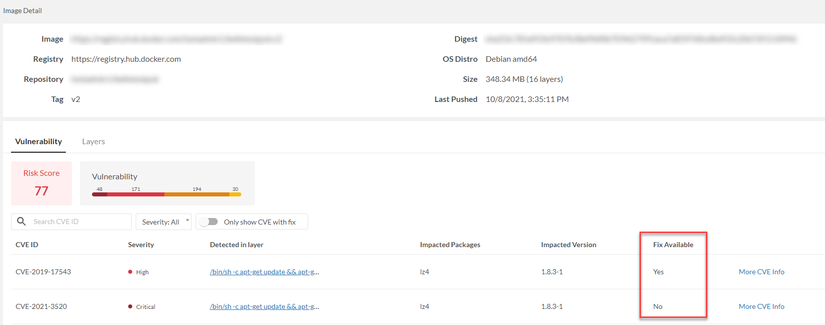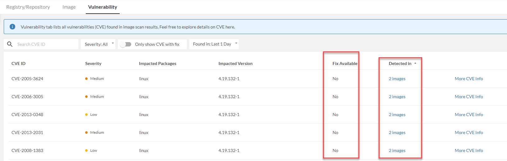 The Fix Available column works like the Registry View where it shows which CVE has fixes available.