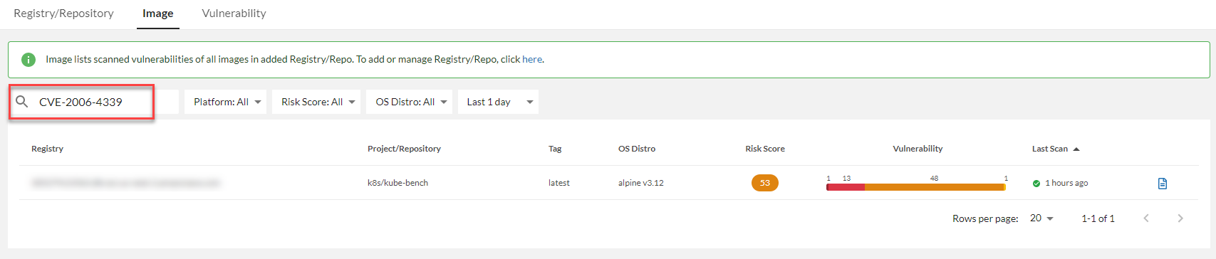 The Detected in column shows the number of the images that are detected to have the specific vulnerability. When clicking on it, only the images with the specific vulnerability will be shown.