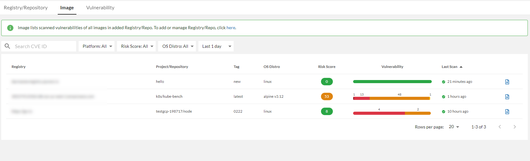 Image View can be accessed by clicking on the Image tab. Image View shows the Vulnerability detected from repositories with registry perspective.
