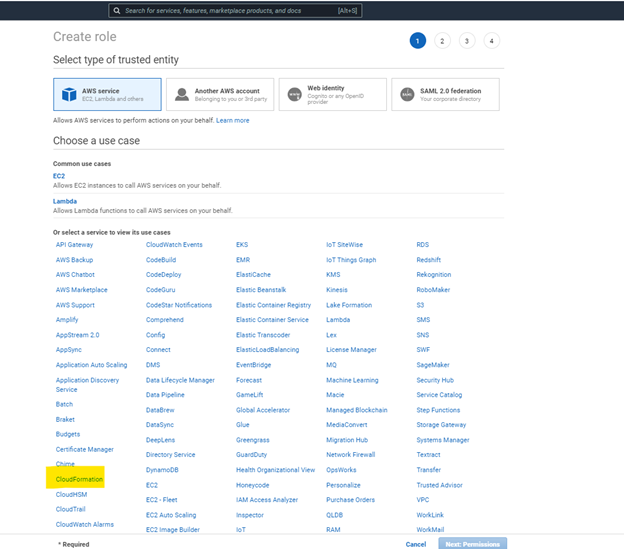 - Click Create Role, while AWS Service is selected, select CloudFormation use case and click Next:.