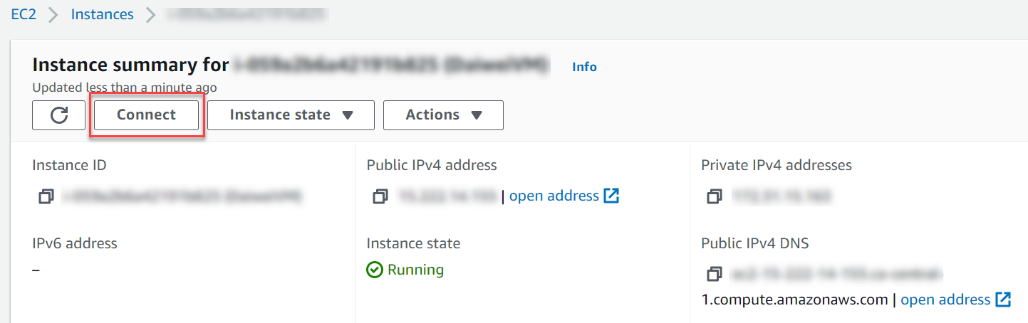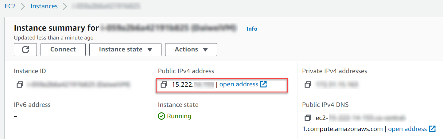 - From AWS console, search and go to EC2, select an EC2 instance that you will be using, and record down the public IP address.