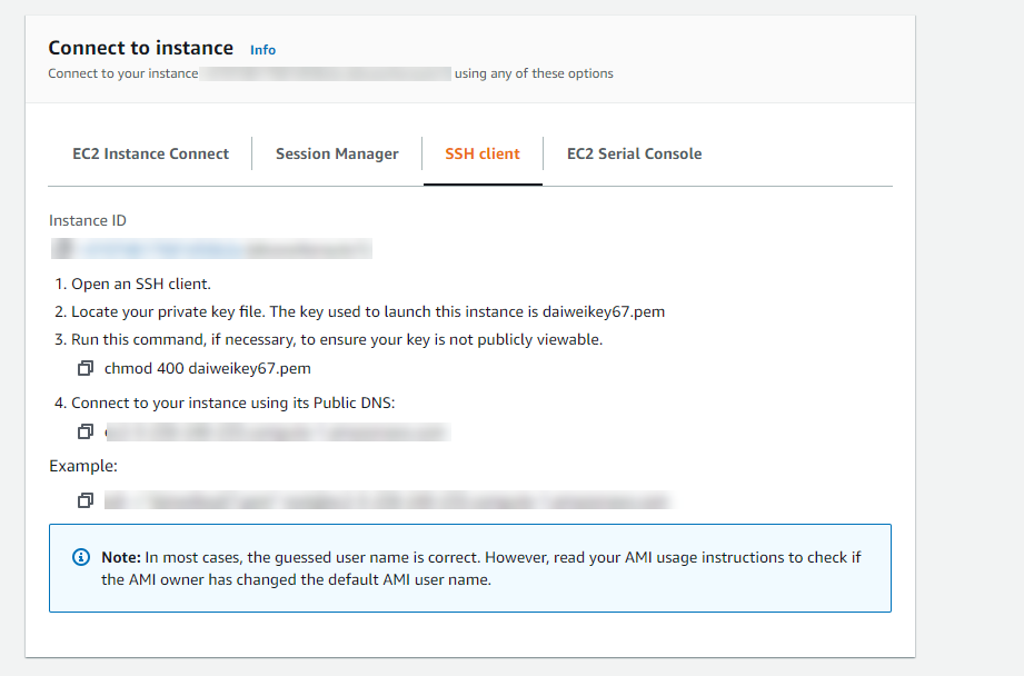 - Go back to the EC2 instance, click Connect and select SSH client tab, use the command to connect to the instance on a SSH client like Git Bash, Putty, etc.