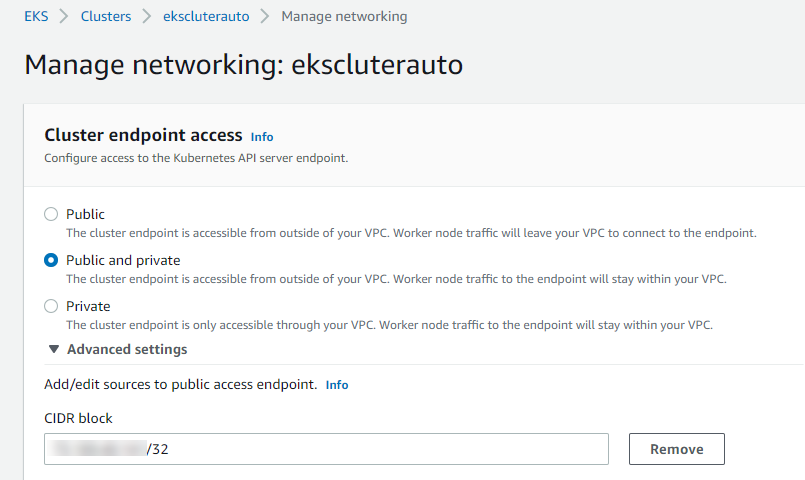 - Click Manage networking, then click Advanced Settings drop down menu to add the EC2 instance public IP address to the list of public access endpoint, the IP should end in "/32".