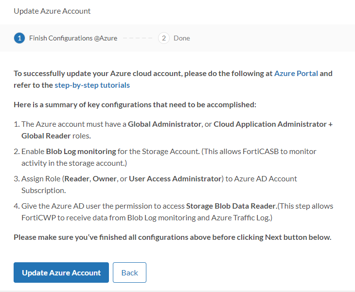 Follow each section below to help you setup the Azure Subscription, Roles, and configure the Blob Storage in preparation to update the Azure installation on FortiCNP. If you have already done any of the configuration when adding the account, you do not need to repeat the same configuration.