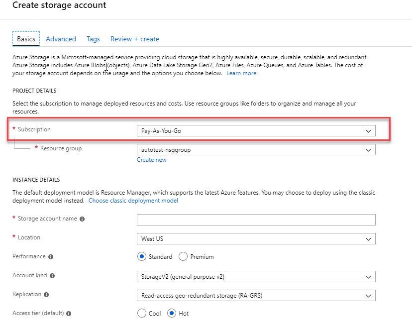 - In Storage account name filed , enter an account name based on your preference.
